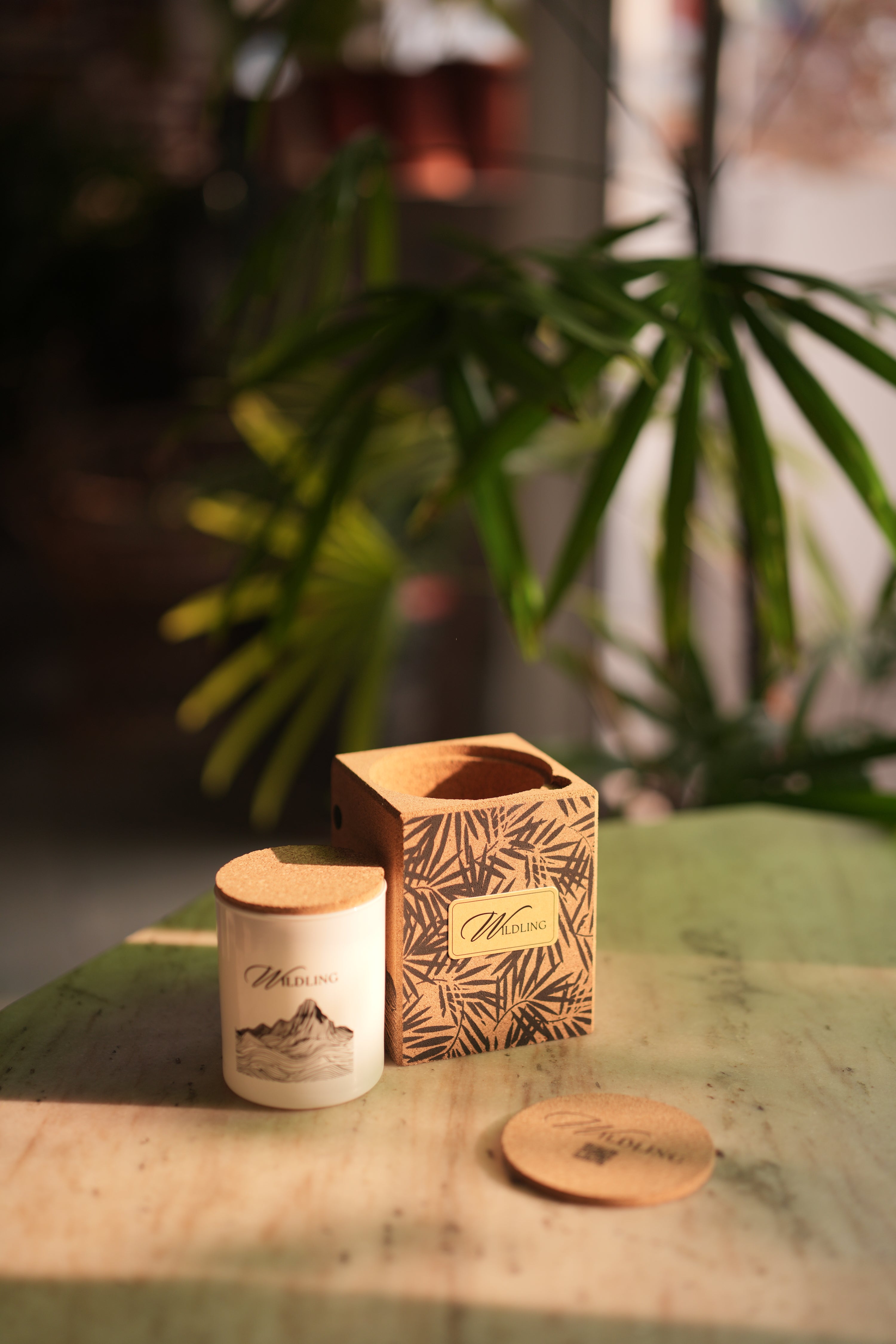 Our signature clean-burning soy candles, packaged in long-lasting, reusable cork boxes.